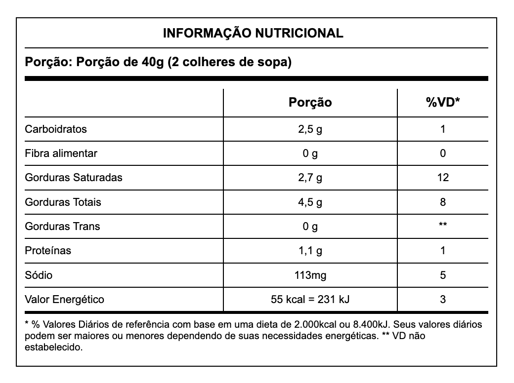 Leite integral e/ou leite integral reconstituído, creme de leite, queijo em pó sabor quatro queijos [queijo, manteiga, leite em pó integral, maltodextrina, cloreto de sódio (sal), extrato de levedura, aroma idêntico ao natural de queijos, emulsificantes fosfato dissódico (INS 339ii) e mono e diglicerídeos de ácidos graxos (INS 471), reguladores de acidez bicarbonato de sódio (INS 500ii) e ácido láctico (INS 270)], cloreto de sódio (sal), mix de aditivos (amido modificado, espessantes carragena INS 407, carboximetilcelulose sódica INS 466, goma tara INS 417 e goma xantana INS 415), aroma idêntico ao natural de quatro queijos, estabilizantes fosfato dissódico INS 339ii e citrato de sódio INS 331iii. Alergênicos: Contém: Leite e derivados, derivados de trigo e soja. Contém: Lactose. Pode conter: centeio, cevada e aveia. Contém Glúten.